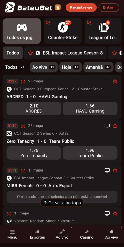 A variedade de mercados e campeonatos também se estende para a seção de e-sports da BateuBet. Portanto, a casa consegue agradar a diferentes estilos de jogadores, incluindo aqueles que buscam apostas em CS2, League of Legends, Dota 2, entre outros.