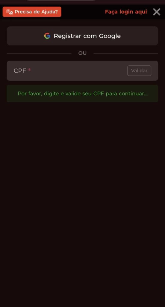 - Toque para se cadastrar com a sua conta Google ou digite o seu CPF;